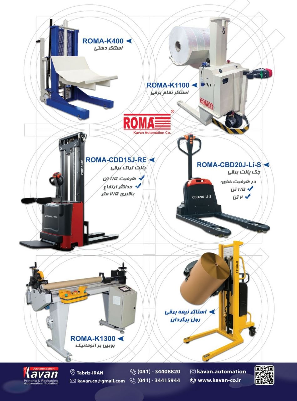 کاوان علاوه بر واردات تجهیزات، در زمینه تولید داخلی نیز پیشگام است. ما باکیفیتترین محصولات استاکر رولبر (دستی و برقی) و بوبینبر اتوماتیک را با برند نامآشنای روما (ROMA) تولید و به بازار عرضه میکنیم و با این تولیدات، از صنعت چاپ کشور حمایت مینماییم.